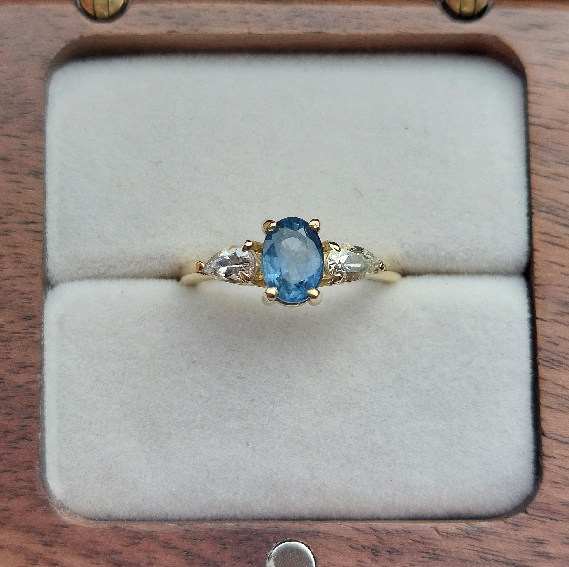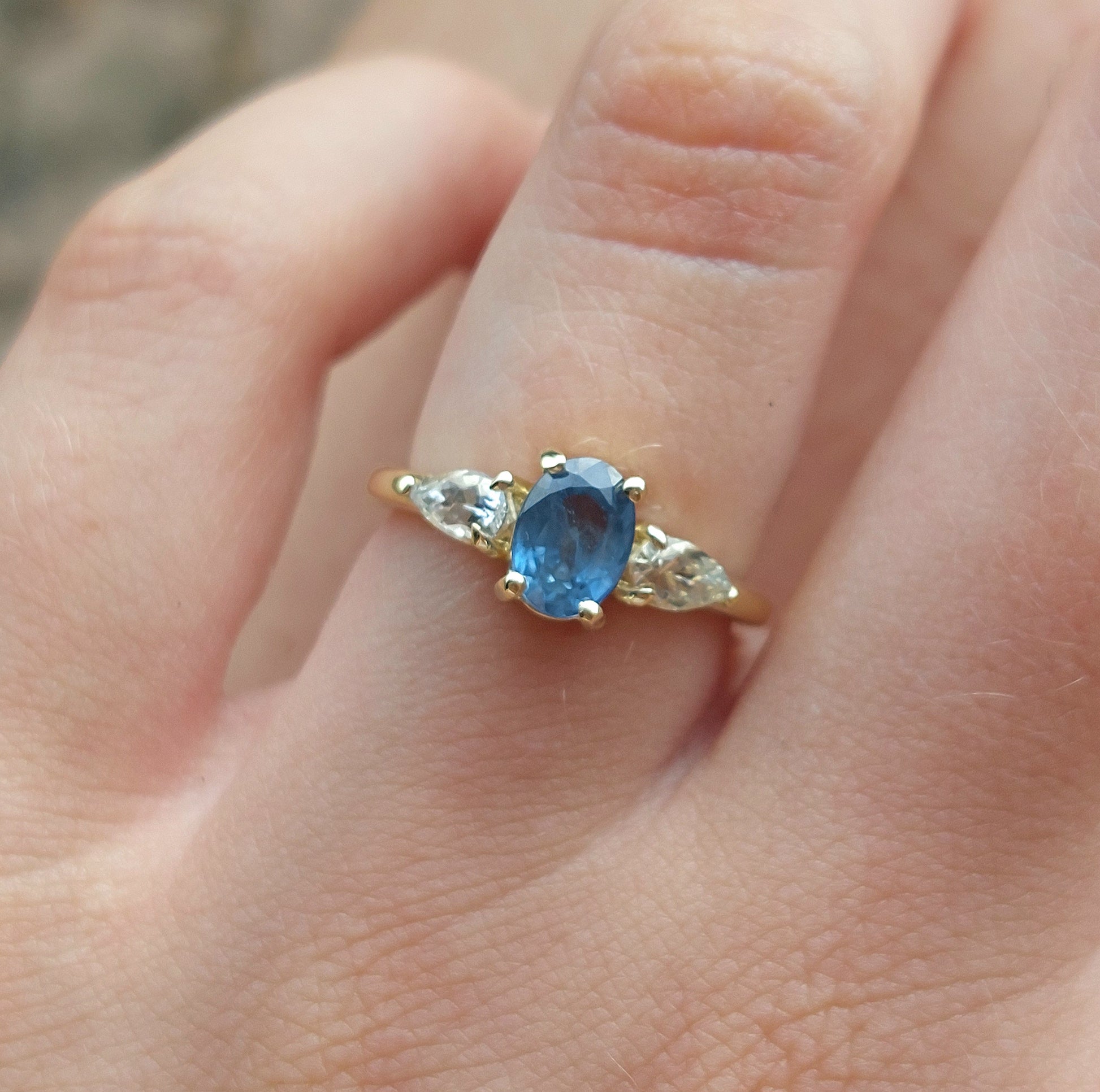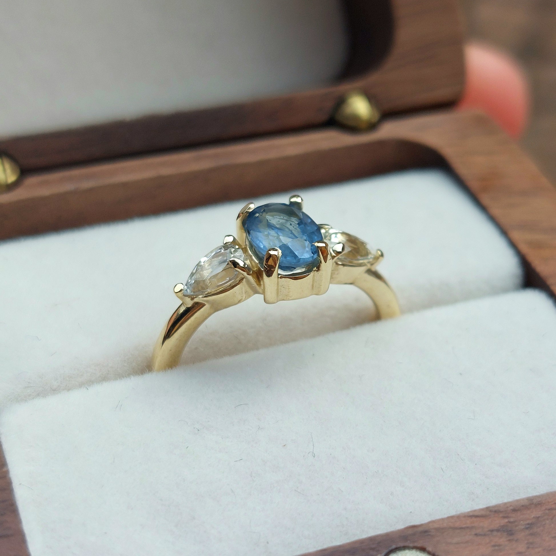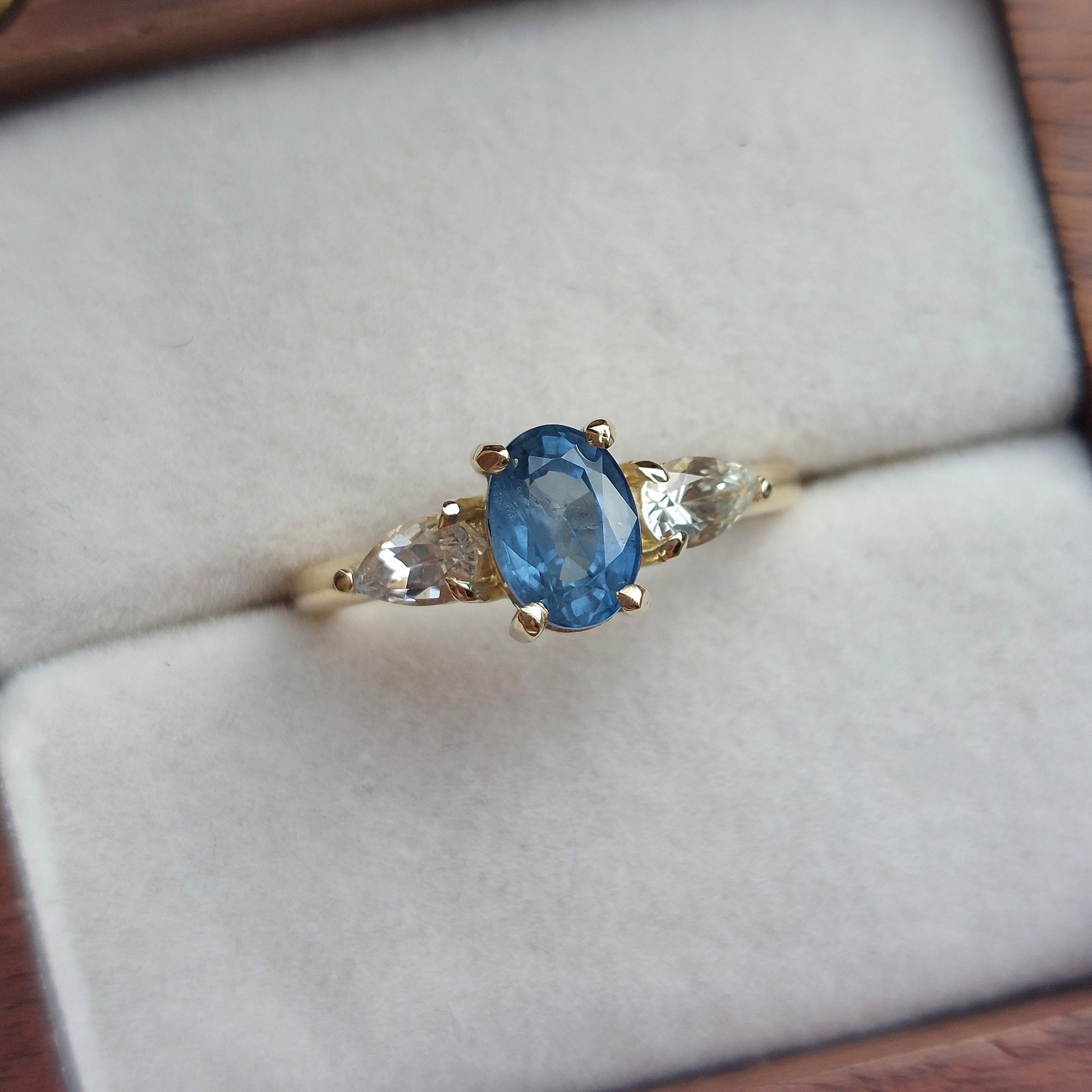 Add a touch of elegance to your collection with this beautifully crafted 1.7mm wide, 9ct yellow gold ring. At its center sits a stunning 7x5mm oval-cut blue Kanchanaburi sapphire, known for its rich, vibrant hue. On either side, two sparkling 5x3mm pear-shaped white sapphires enhance the brilliance and sophistication of the design.