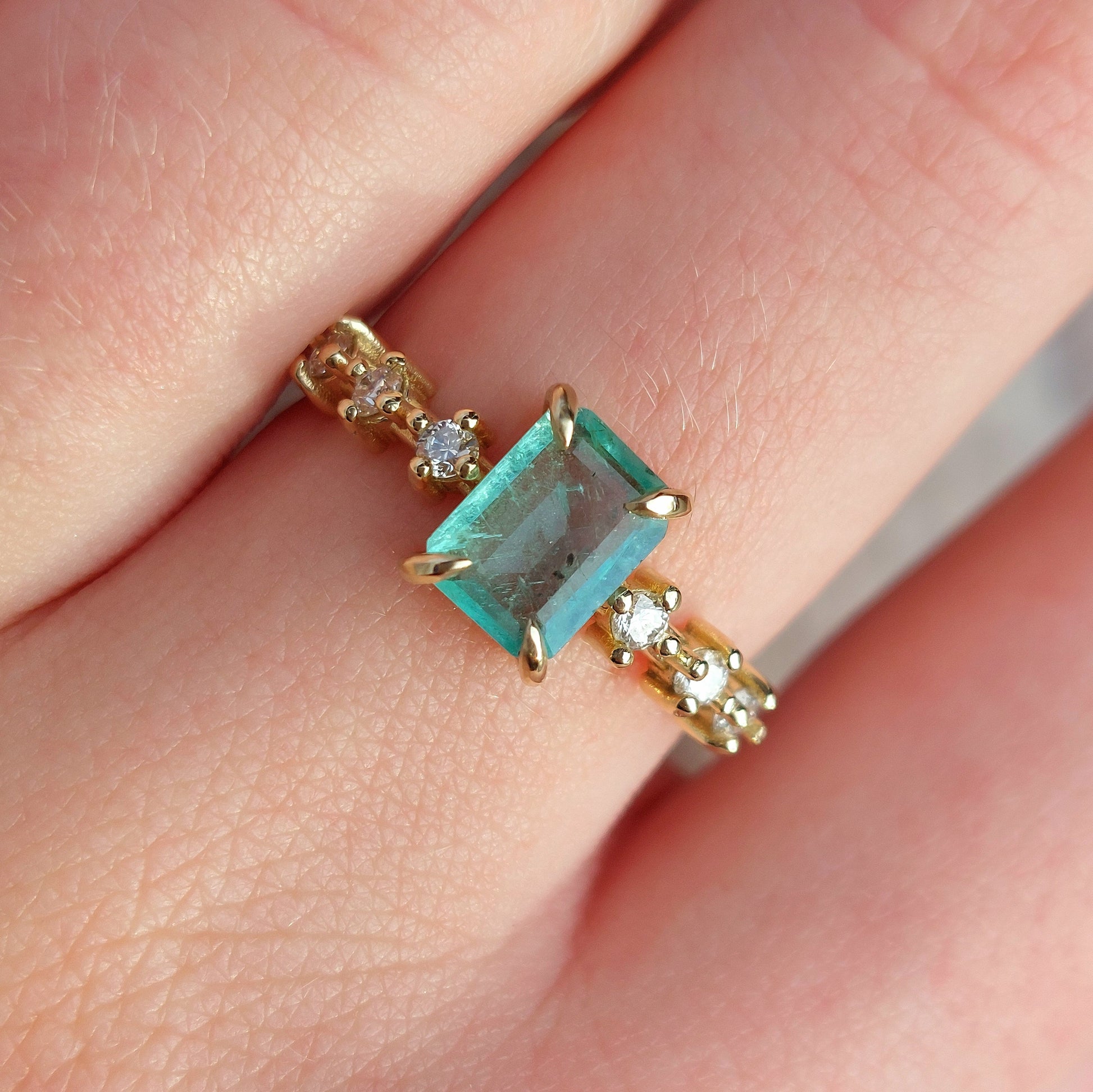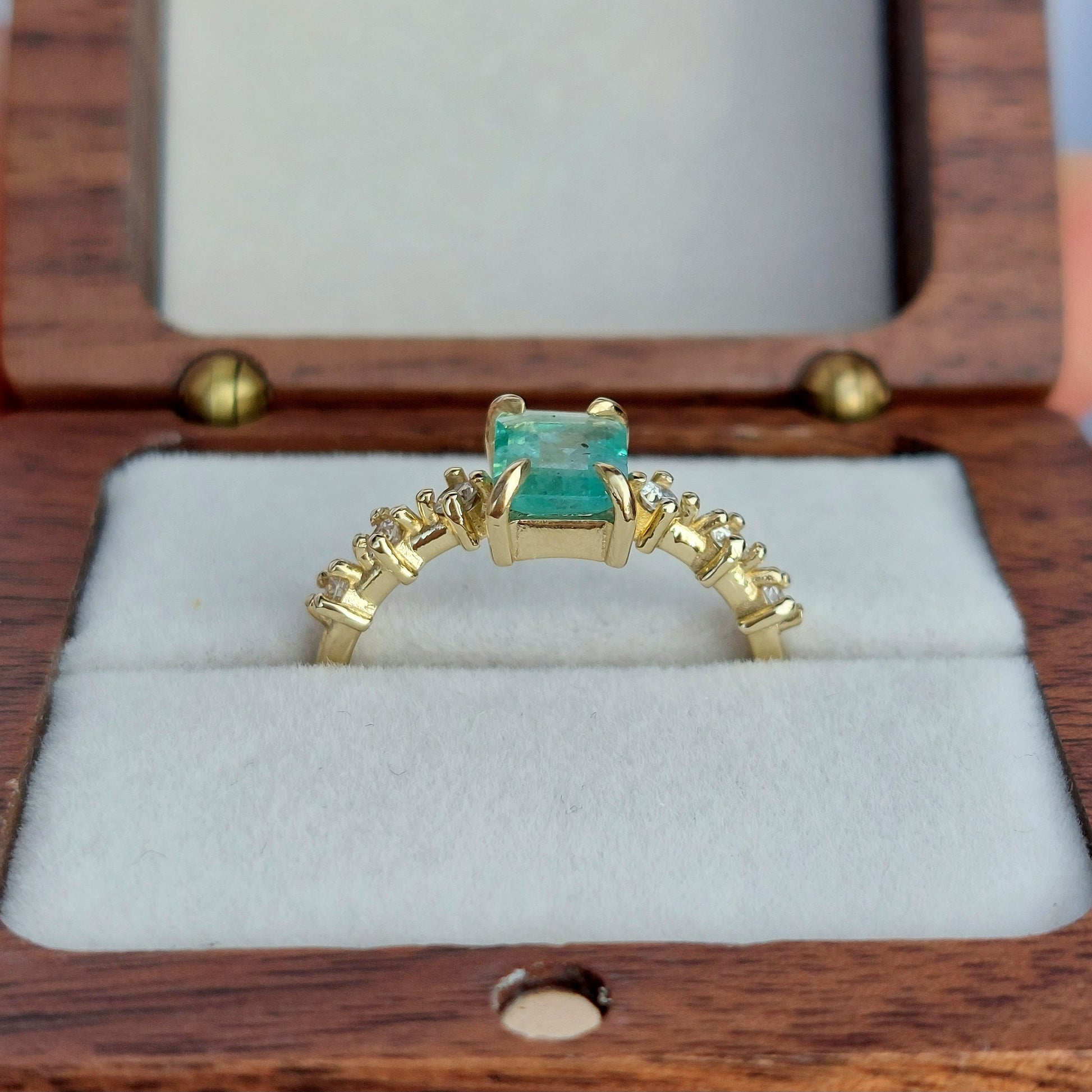 This unique ring features a beautiful 7×5 mm emerald-cut Colombian emerald, set in warm 9ct yellow gold. Its natural character and soft internal inclusions give the stone a dreamy, organic charm perfect for those who appreciate gemstones with personality and origin.